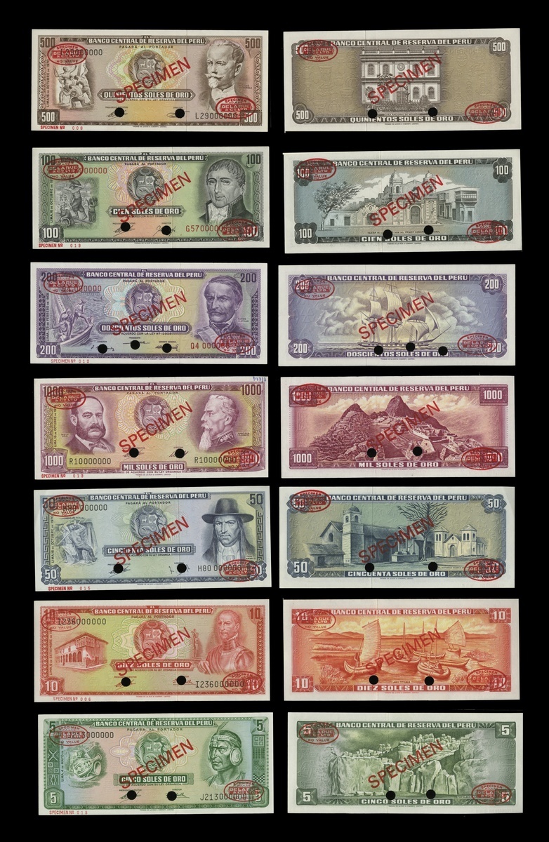 Peru. Banco Central de Reserva del Peru. 1969 Issue Specimen Set. 5, 10, 50, 100, 200 500 and 1000 Soles de Oro. P-99s-105s. Portraits at right, artifacts, buildings, scenes etc. at left. Diagonal red SPECIMEN at center, TDLR stamps top left and bottom right, two punch cancels bottom center. Notation top margin of last. AU-Uncirculated. [7]