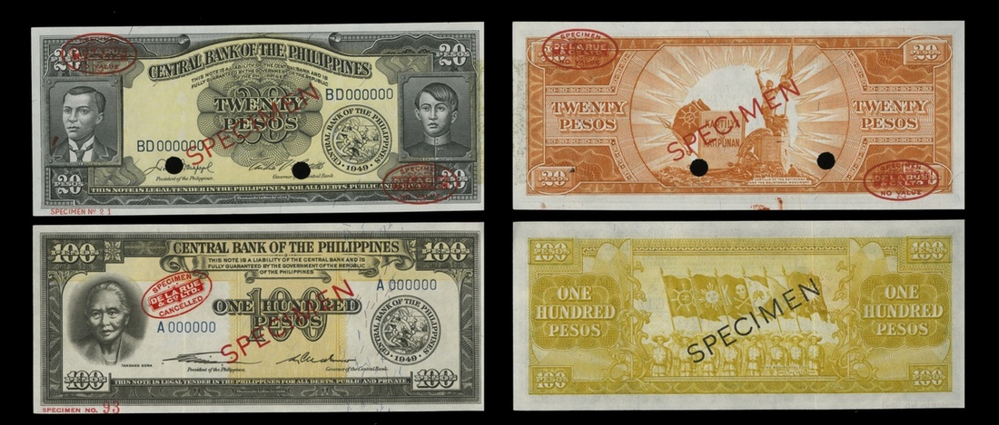 Philippines. Central Bank. 1949 ND "English" Issue Specimen notes - 20 and 100 Pesos. P-137s4, 139s. Portraits of Bonifacio and Jacinto left and right; Portrait of Tandang Sora at left. Diagonal red SPECIMEN at center (black on back of the 100 Pesos), TDLR stamps top left and bottom right, the first with two punch cancels bottom center. The 20 Pesos with glue residue right front margin and very light ink stain from stamping in marginUncirculated and AU.[2]