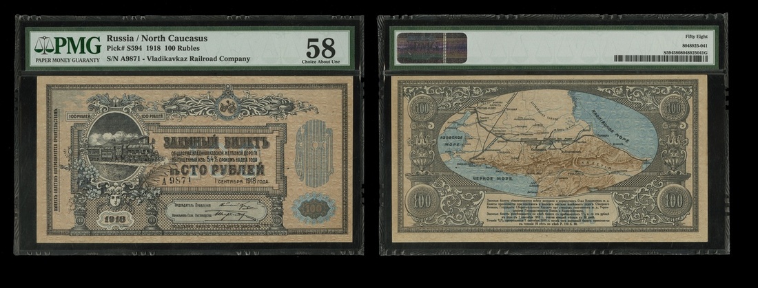 Russia. North Caucasus. Vladikavkaz Railroad Co. 100 Rubles. 1918. P-S594. Steam passenger train at left, Caucasus map on back showing railroad's main line from Rostov-on-Don to Petrovsk and Baku. PMG Choice About Unc. 58.