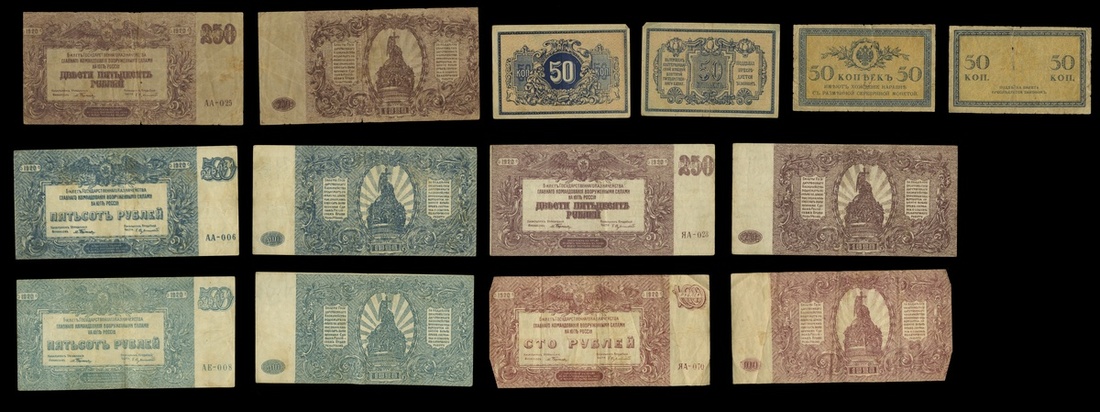 Russia. Lot of mostly Revolutionary Period issues (30). South Russia, etc; also Bulgaria, Germany, Austria and Mexico, all 1920's and before, and a Spanish note. 8 raggedy and poor, the rest Good to EF. [49]