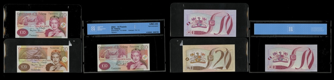 St. Helena. Government of St. Helena. 2004 Issue trio. 10 (2) and 20 Pounds. P-12a, 13a. Harbor view left, Queen Elizabeth II right. Crisp Unc., CCCS Unc-65, Crisp Unc. [3]