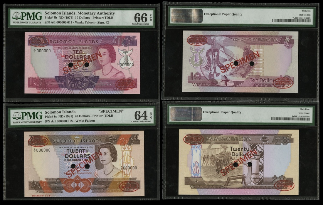 Solomon Islands. Monetary Authority. Pair of Specimen Notes. 10 and 20 Dollars. ND (1977 and 1981). P-7s, 8s. Queen Elizabeth II portrait at right. Diagonal red SPECIMEN at center, TDLR stamps bottom left, top right, two punch cancels at center. PMG 66 Gem Uncirculated EPQ, PMG 64 Choice Uncirculated EPQ. [2]