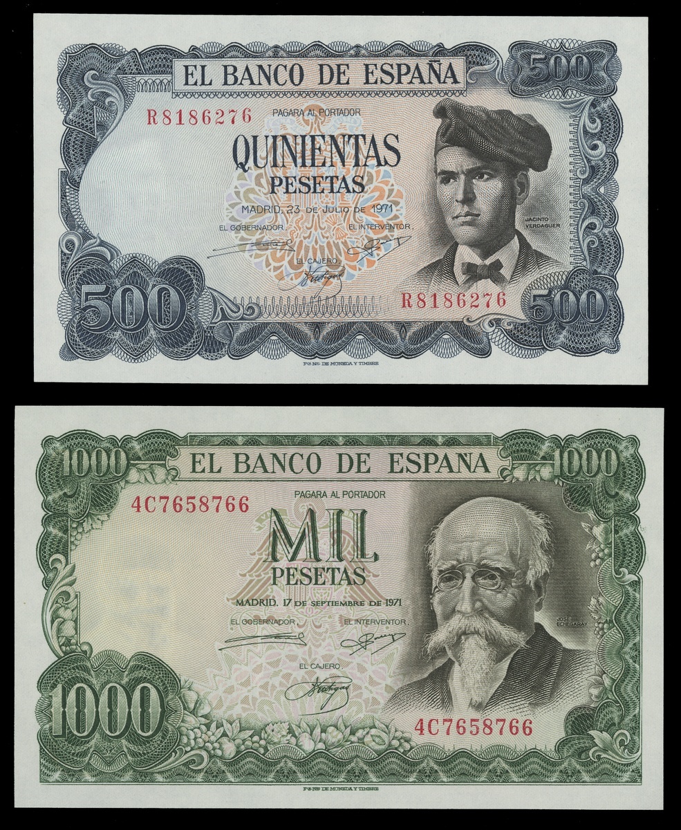 Spain. Banco de España. Pair: 500 and 1000 Pesetas. 1971. P-153a, 154. Jacinto Verdaguer at right; Mt. Canigó and the village of Vignolas d'Oris on back. José Echegaray at right; Bank of Spain on back. Uncirculated. [2]