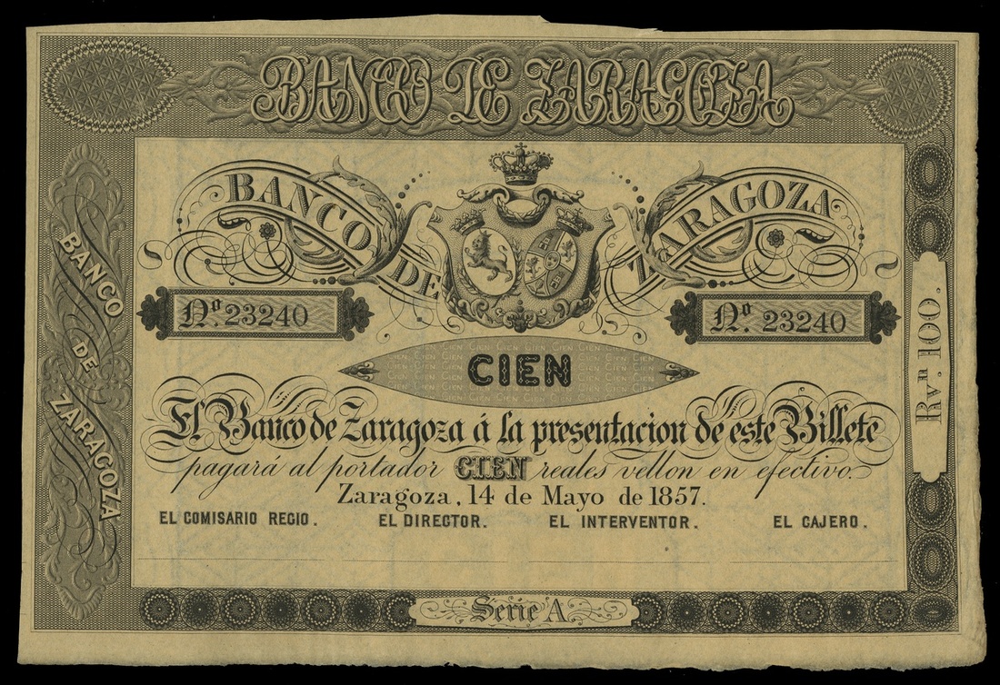 Spain. Banco de Zaragoza. 100 Reales de Vellon. 1857. P-S451r. No. 23240. Black on cream. Crowned Arms at center. Remainder. AU.