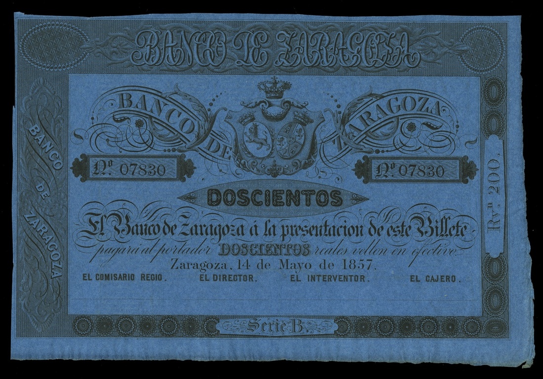 Spain. Banco de Zaragoza. 200 Reales de Vellon. 1857. P-S452r. No. 07830. Black on blue. Crowned Arms at center. Remainder. AU.