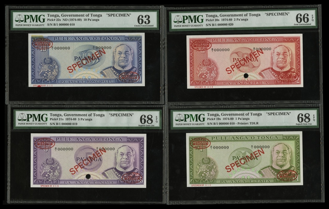 Tonga. Pule' Anga 'o Tonga. Pa'anga, 2, 5 and 10 Pa'anga. ND (1974). P-19s-22s. Specimen. Portrait of King Taufa'ahau at right. The 1 and the 5 PMG 68 Superb Gem Unc EPQ, the second PMG 66 Gem Uncirculated EPQ, the later PMG 63 Choice Uncirculated. [4]