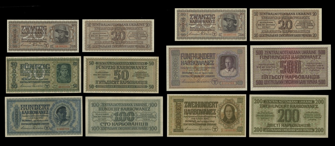 Ukraine. German Occupation - World War II. Zentralnotenbank Ukraine. 1942 Issues. 1, 5, 10, 20 (2), 50, 100, 200, 500 Karbowanez. P-49, 51, 52, 53 (2), 54-57. Workers portraits. The 20 and 500 Karbowanez Uncirculated, the others EF-AU. [9]