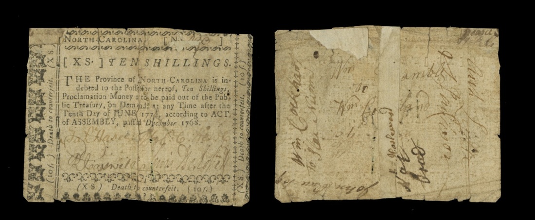 North Carolina. NC-130, December 1768. Ten Shillings. No.-3. Repaired, rough edges, center fold. Minor tears and pinholes. Fine Details.