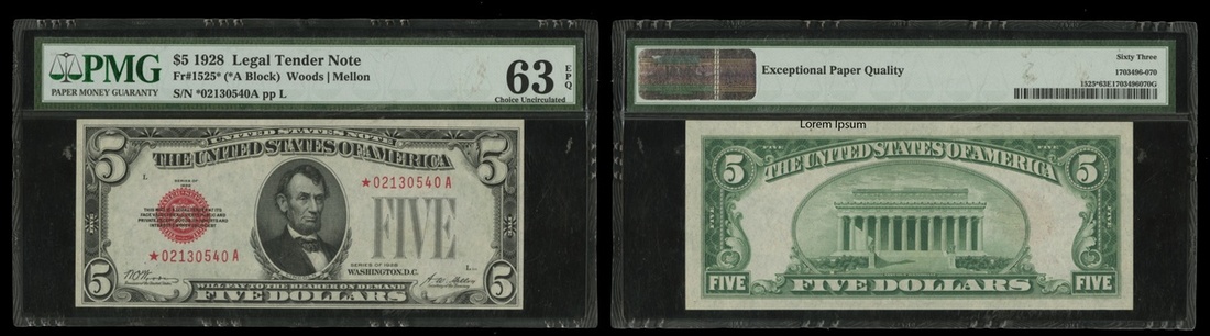 Fr. 1525*. $5. Legal Tender. 1928. Lincoln. Red seal. Star. No. *02130540A. PMG Choice Uncirculated 63 EPQ.