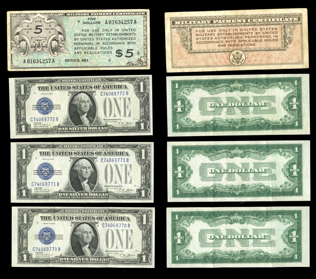 Fr. 1601. Trio of $1 Silver Certificates. 1928A (3). Washington. Blue seal. Consecutive numbers: C74069770B-C74069772B. VF+. Good snap; also Military Payment Certificate. Series 461. $5. VF. [4]