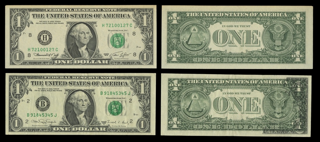 A Pair of Federal Reserve $1 Notes. Fr. 1908-H. Series 1974. No. H72100127C. About Uncirculated; Fr. 1915-B. Series 1988 A. No. B91845345J. Error note. Ink from front plate transferred on back of note, Very Fine. [2]