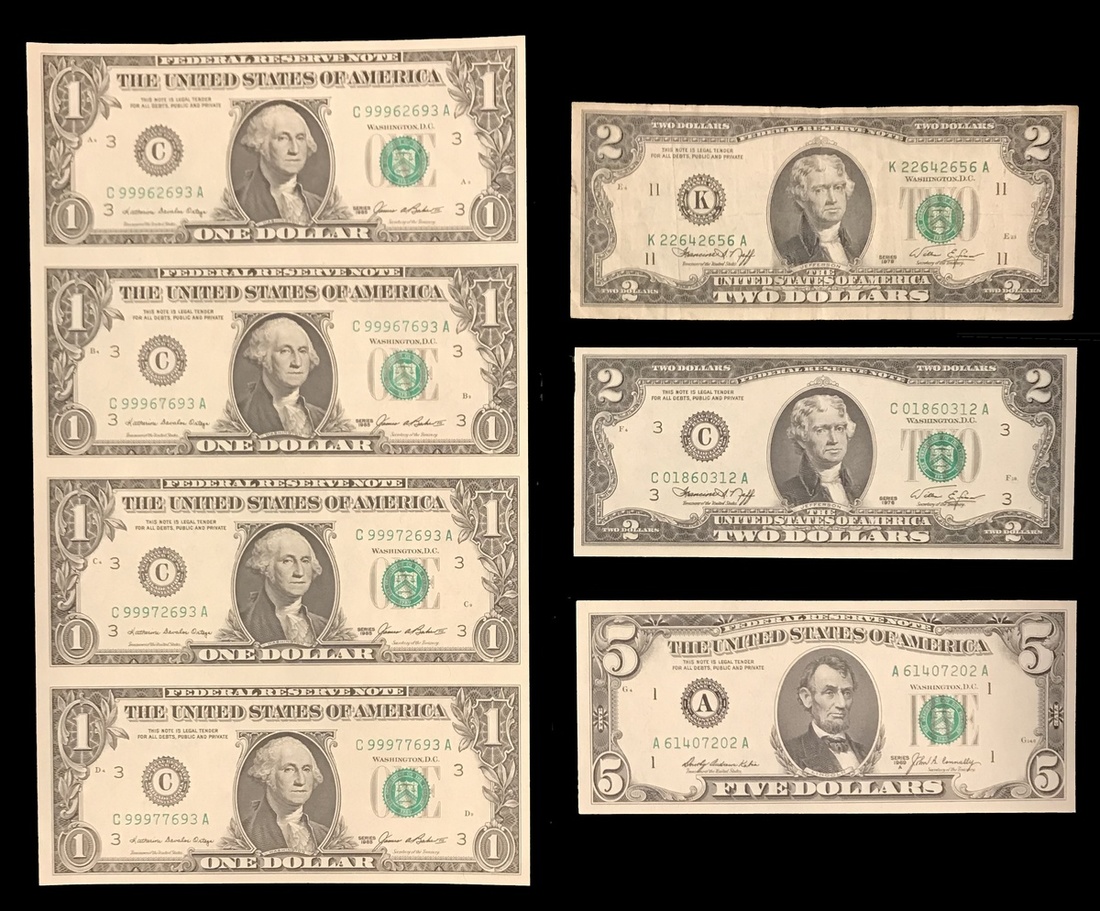 Uncut Sheet of Four $1 1985 Federal Reserve Notes, Uncirculated. Also included are two 1976 $2 FRNs, Fine and Unc., and a 1969A $5 FRN Unc.