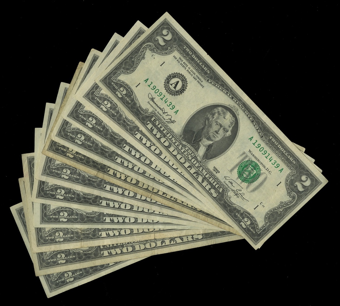 Stack of 1976 $2 Federal Reserve Notes. Various districts. A few with numbers penciled/inked on front. Fine-Unc. [100]