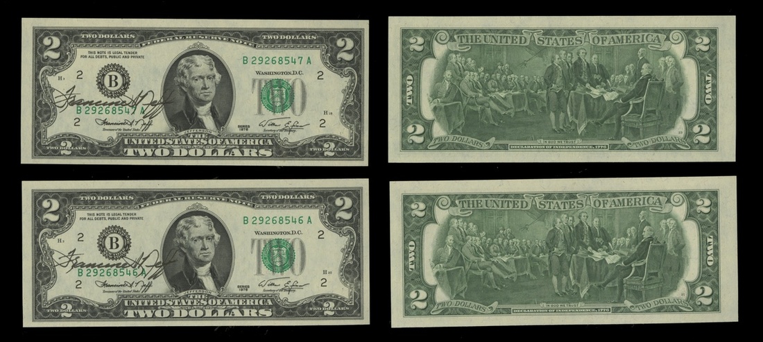 Pair of Autographed 1976 $2 Federal Reserve Notes. New York. The Treasurer, Francine I. Neff signs her autograph in black ink above her note signature. Consecutive numbers. [2]