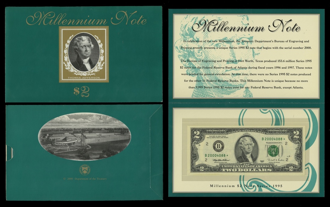 Complete 1995 $2 Federal Reserve Star Note Set. All 12 districts. Fr.1936A*-L*. Each note in a BEP "Millennium Note" folder (their serial numbers all start with "2000") Crisp Uncirculated. [12]