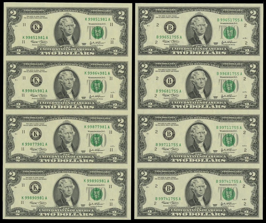 Group of 2003-2003A $2 Federal Reserve Note Sheets of four. 2003 - B, K; 2003A -- L (2). Crisp Uncirculated. [4 Sheets of four]