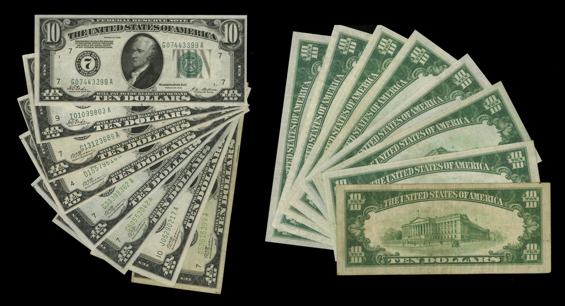 $10 Federal Reserve Note 1928 Lot. Tate-Mellon. Chicago; Minneapolis. Fr. 2000G, I. EF and pressed VF. Woods-Mellon. A. Chicago; B. Cleveland, Chicago (2), Kansas City. Fr. 2001G, 2002D, 2002G, 2002J. EF, Unc., AU, Unc. and EF; Woods-Mills. C. Chicago. Fr. 2003G. VF. [8]