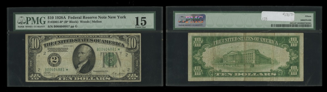 Fr. 2001-B*. $10 Federal Reserve Note. 1928A. New York. No. B00404881*. G. PMG Choice Fine 15.
