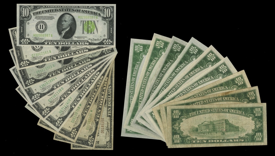 Assortment of 1934 $10 Federal Reserve Notes. Julian-Morganthau. Light green seal. St. Louis. Fr. 2004H. Unc., darker seal. Chicago. Fr. 2005Gm. EF; A. Chicago. Fr.2006G. AU; Julian-Vinson. B. Chicago. Fr. 2007G; Julian-Synder. C. Chicago. Fr.2008G. Unc.; Clark-Snyder. D. New York. Fr. 2009B. EF; Star notes. A Chicago. Ink lost on half of Hamilton, VG; D. Chicago. F-VF; also National Currency $10. Mahoning National Bank of Youngstown, Ohio. Ch. 2350. 1929 Type I. F-VF. [9]