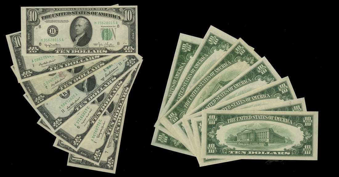 Assortment of 1950 $10 Federal Reserve Note. Clark-Snyder. St. Louis. Uncirculated, Priest-Humphrey. A. Boston. EF-AU, Chicago. VF with red bank stamp; Priest-Anderson. B. Dallas. AU-Unc; Smith-Dillon. C. Atlanta. EF; Granahan-Dillon. D. Boston. U; and Granahan-Fowler. E. Chicago. EF-AU. [7]