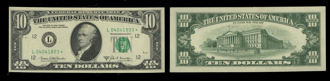Fr.2020L*. $10 Federal Reserve Note. 1969B. San Francisco. Banuelos-Shultz. No. L 04041803*. EF.
