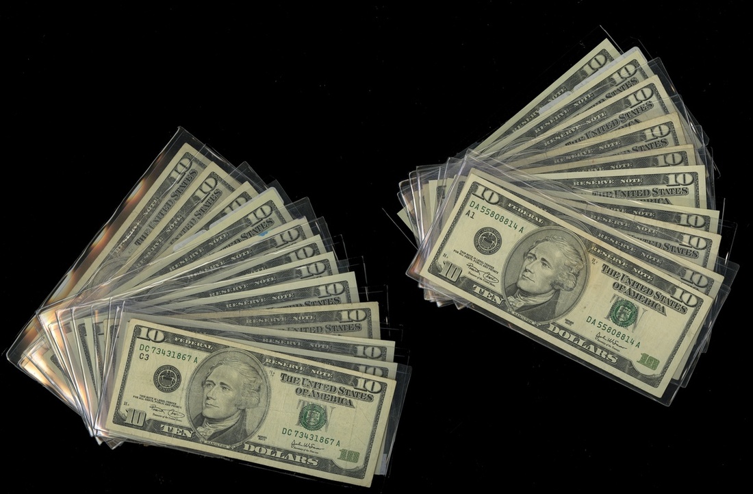 Large grouping of 2003 $10 Federal Reserve Notes. Includes: A (2), B (7), C (5), D (3), D*, E (3), F (4), G (9), H (4), H*, I (3), J (3), J* (2), K (7), and L (7). One a radar note, one a decreasing ladder. About VF-CU. [61]