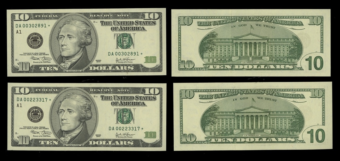 Pair of Fr. 2037A*. $10 Federal Reserve Notes. 2003. Star. Boston. Nos. DA 00223317* and DA 00302891*. Crisp Uncirculated. [2]