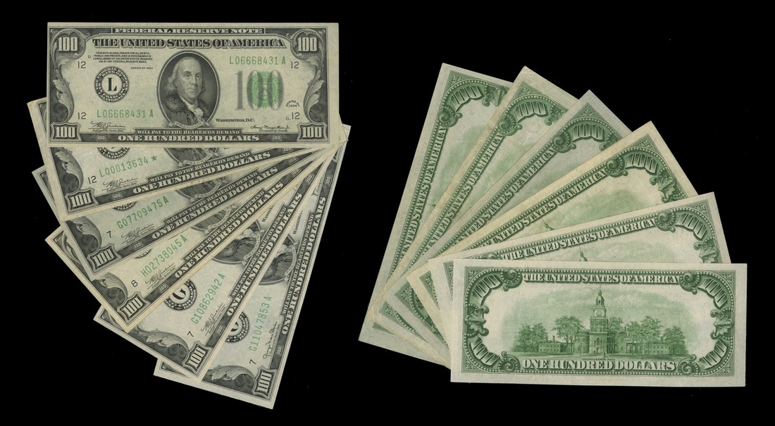 1934 Darker Seal $100 Federal Reserve Note Type Grouping. Fr. 2152a-L. San Francisco. EF; Fr.2152a-L*. VF; 1934A. Fr. 2153Gm. Chicago. Unc.; 1934 B. St. Louis. Fr.2154H. EF; 1934C. Chicago. Fr. 2155G. Unc.; and 1934D. Chicago. Fr. 2156G. Unc. [6]