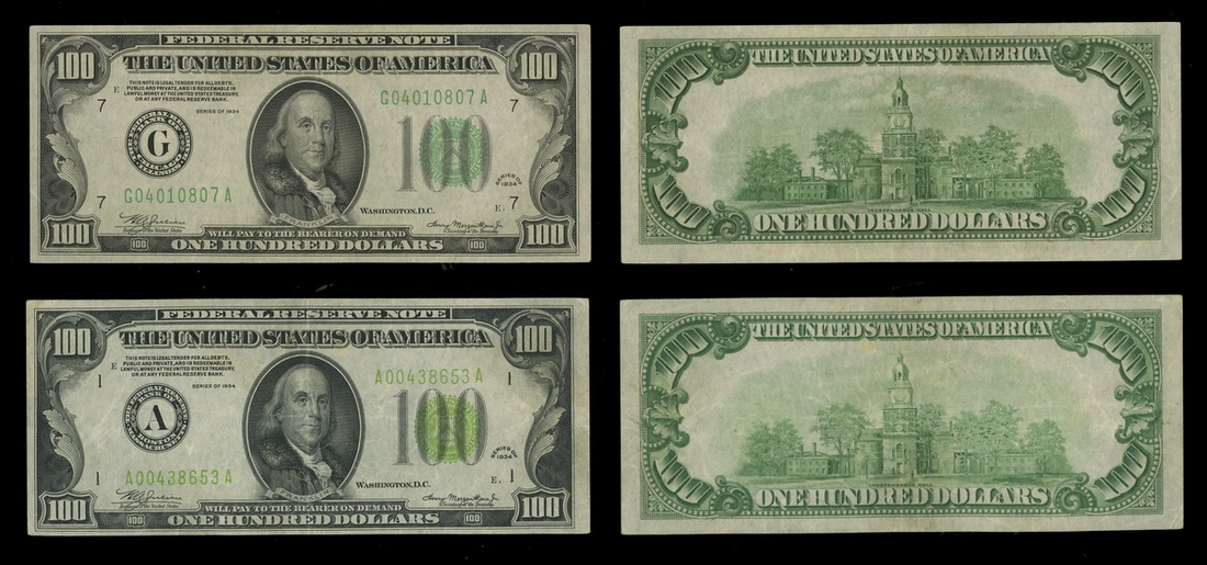 Seal Type Pair of 1934 $100 Federal Reserve Notes. Light green seal. Boston. Fr. 2152A. VF-EF; and darker, blue-green seal. Chicago. Fr. 2152a-G. Choice AU. [2]