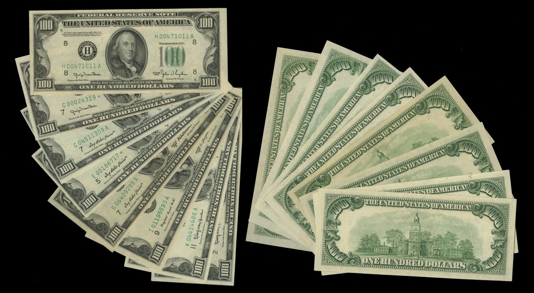 1950 $100 Federal Reserve Note Type Assortment. Fr. 2157H. St. Louis. Unc.; Fr. 2157Gm*. Star. Chicago. Unc.; 1950A. Fr. 2158G. Chicago. AU; Fr.2158E*. Choice EF; 1950B. Fr.2159G. Chicago. EF; 1950C. Fr. 2160I. Minneapolis. AU; 1950D. Fr.2161K. Dallas. Unc.; and 1950E. Fr.2162B. New York. Unc. [8].