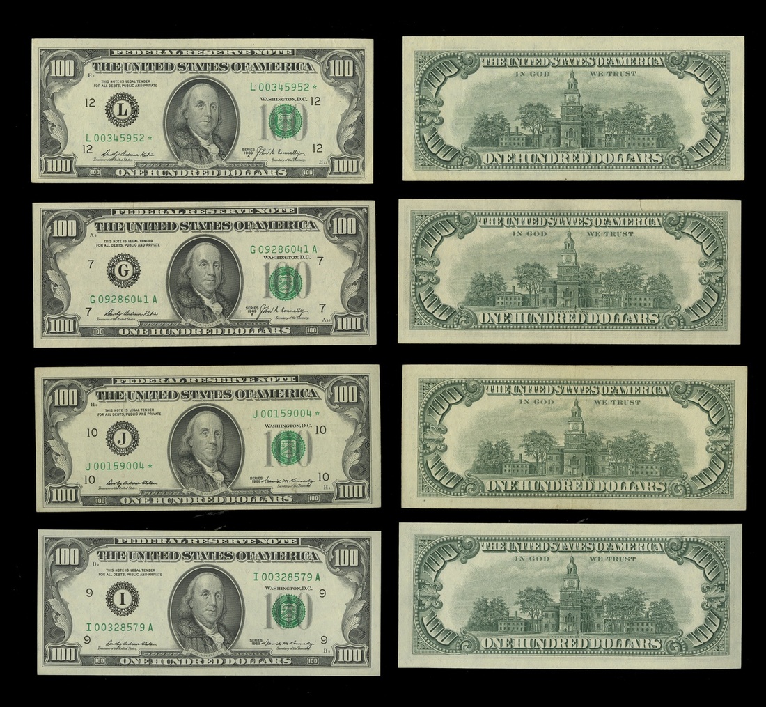 Type Quartet of 1969 $100 Federal Reserve Notes. 1969. Minneapolis, Star - Kansas City. Fr. 2164L, 2164J*. CU and EF; 1969A. Chicago, Star - San Francisco. Fr. 2165G, 2165L*. EF and AU. [4]