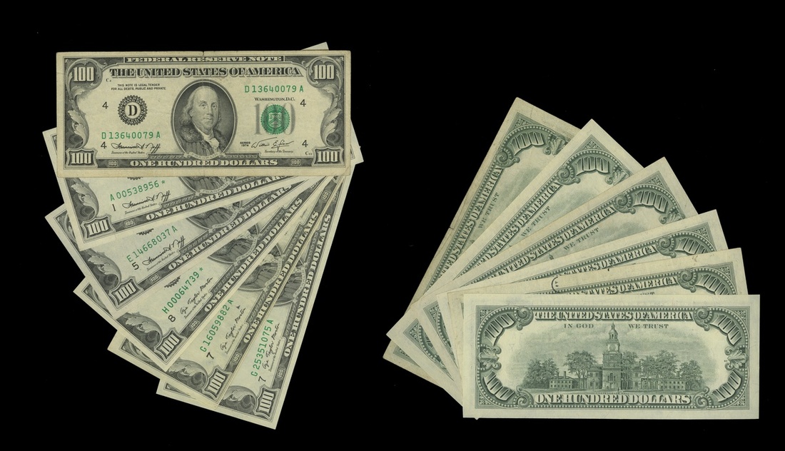 1974-1977 $100 Federal Reserve Note Assortment. 1974 - Cleveland, Richmond, Boston*; 1977 - Chicago (2), St. Louis*. VF-Unc. [6]