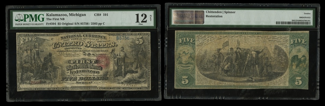 Michigan. Kalamazoo. Ch. 191. First National Bank of Kalamazoo. $5. Feb. 20, 1864 Original series. Fr. 394. No. 2503, Treasury number 85756, with no suffix of prefix, printed in blue. Rare. PMG Net Fine 12, restoration. Ex Lyn Knight Auction, March 2007, lot 1843.