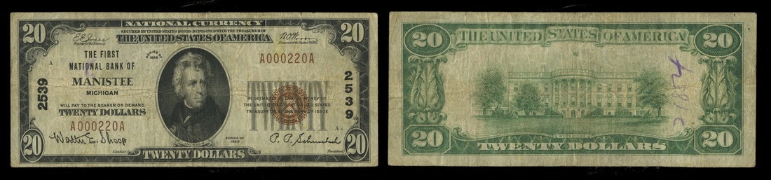 Michigan. Manistee. Ch. 2539. First National Bank of Manistee. $20. 1929 Type I. No. A000220A. Number inked on back. About Fine.