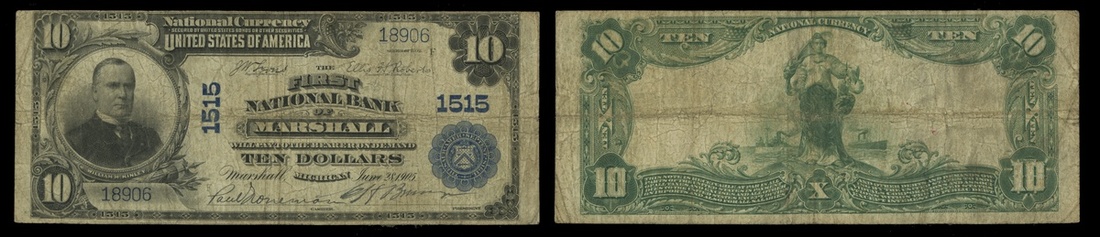 Michigan. Marshall. Ch. 1515. First National Bank of Marshall. $10. 1902 Plain Back. Fr. 624. No. 18906. VG-About Fine.