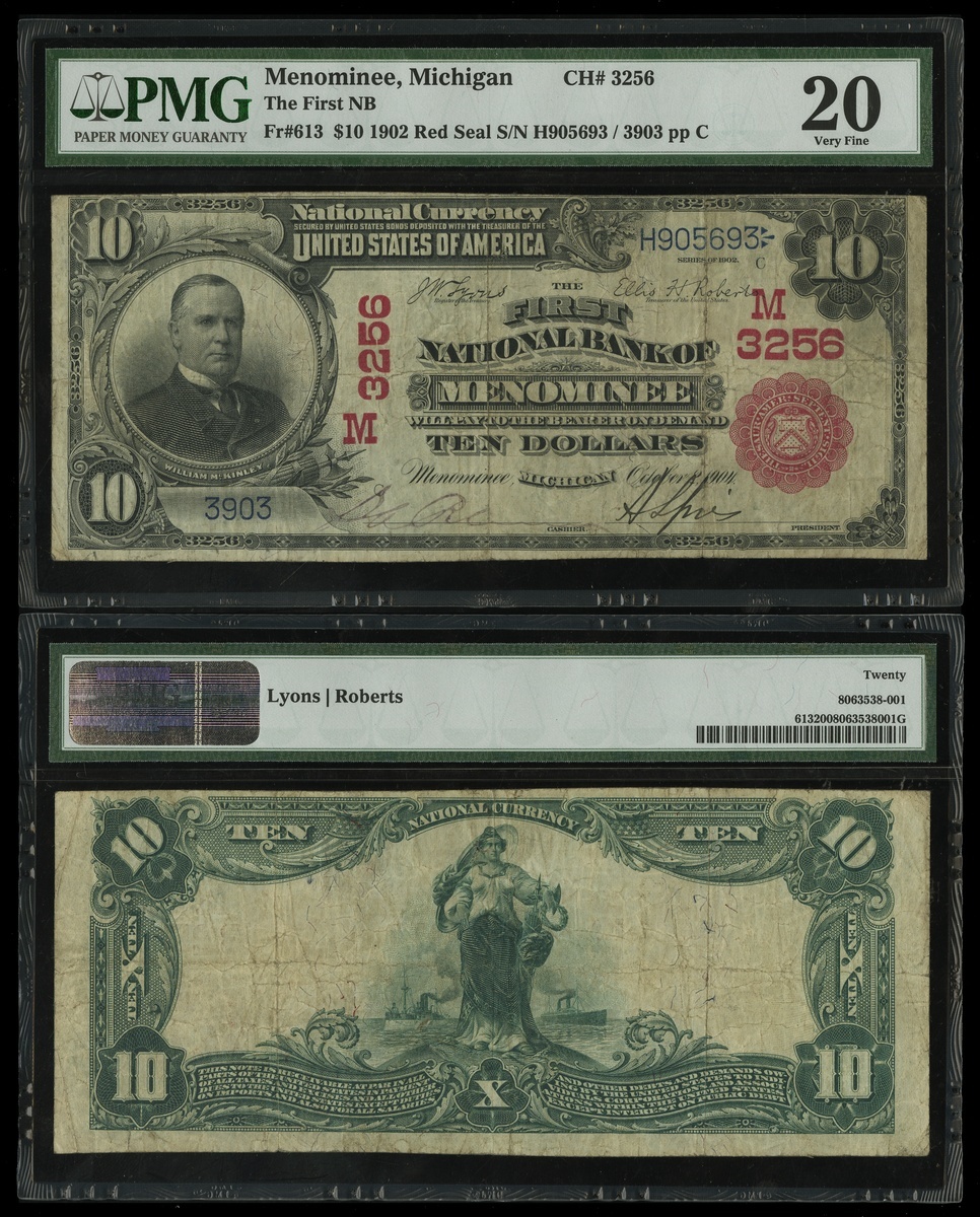 Michigan. Menominee. Ch. 3256. First National Bank of Menominee. $10. 1902 Red Seal. Fr. 613. No. 3903. PMG Very Fine 20.
