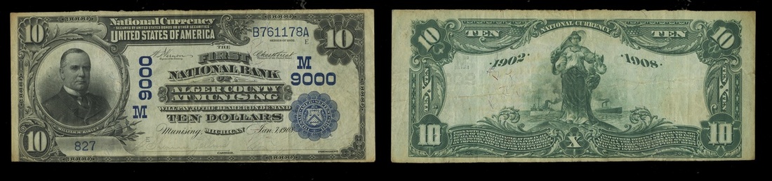 Michigan. Munising. Ch. 9000. First National Bank of Alger County at Munising. $10.  1902 Date Back. Fr.618. No. 827. Tight bottom, top a bit jagged. Fine-About VF.