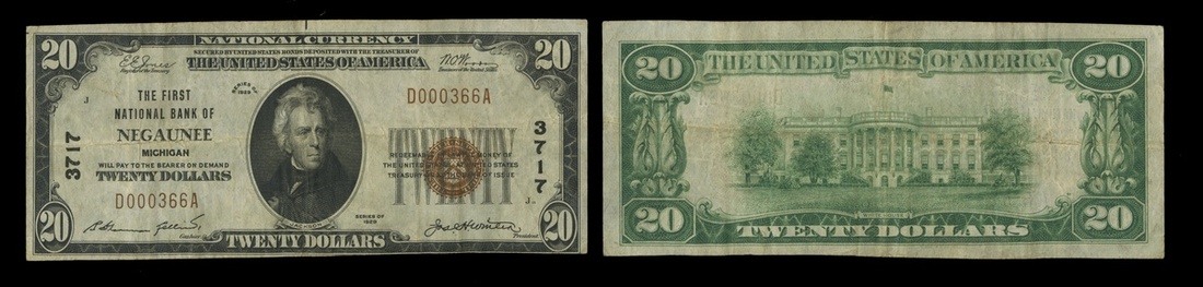 Michigan. Negaunee. Pair: First National Bank of Negaunee. Ch. 3717. $20. 1929 Type I. VF; and Negaunee National Bank. Ch. 9556. $10. 1929 Type I. Light stain. About VF. [2]