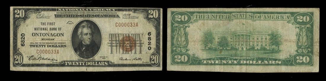 Michigan. Ontonagon. Ch. 6820. First National Bank of Ontonagon. $20. 1929 Type I. No. C000033A. Tight upper margin. Fine-About VF.