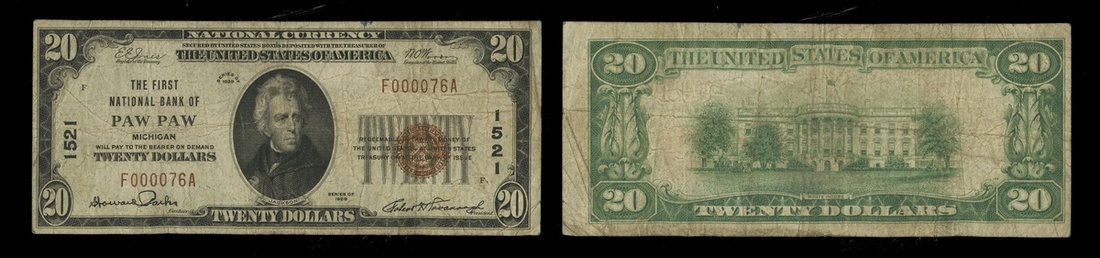 Michigan. Paw Paw. Ch. 1521. First National Bank of Paw Paw. $20. 1929 Type I. No. F000076A. About Fine.