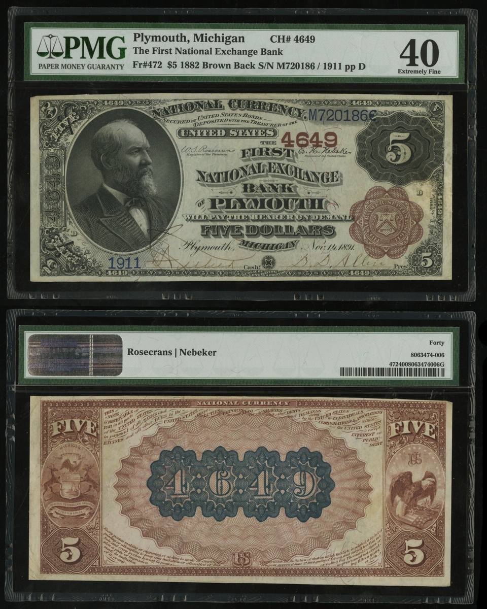 Michigan. Plymouth. Ch. 4649. First National Exchange Bank of Plymouth. $5. 1882 Brown Back. Fr. 472. No. 1911. PMG Extremely Fine 40.