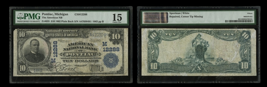 Michigan. Pontiac. Ch. 12288. The American National Bank of Pontiac. $10. 1902 Plain back. Fr. 635. No. 1662. Only a few known. PMG Choice Fine 15, repaired, corner tip missing.