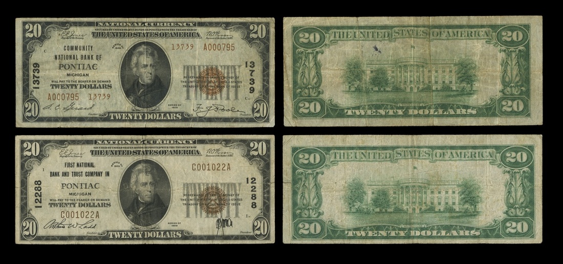 Michigan. Pontiac. $20 Pair: First National Bank and Trust Company in Pontiac. Ch. 12288. 1929 Type I. Fine-About VF; and Community National Bank of Pontiac. Ch. 13739. 1929 Type II. Fine. [2]