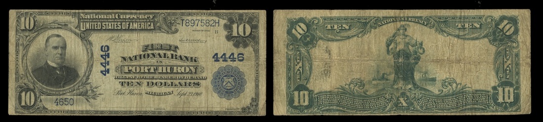 Michigan. Port Huron. Ch. 4446. First National Bank in Port Huron. $10. 1902 Plain Back. No bank signatures. Fr. No. 4650. The second and rarest of this bank's four titles with just two notes known to Kelly. Tight bottom margin. Very Good+. Ex R.M. Smythe Auction 207, March 2, 2001, lot 2842.