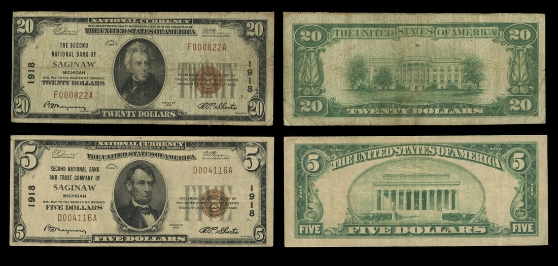 Michigan. Saginaw. Pair: Second National Bank of Saginaw. Ch. 1918. $20. 1929 Type I. About Fine; and Second National Bank and Trust Company of Saginaw. $5. 1929 Type I. About VF. [2]