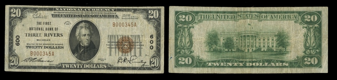 Michigan. Three Rivers. Ch. 600. First National Bank of Three Rivers. $20. 1929 Type I. No. B000345A. About Very Fine.
