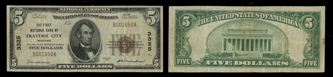 Michigan. Traverse City. Ch. 3325. First National Bank of Traverse City. $5. 1929 Type I. No. B001650A. Fine-About VF.