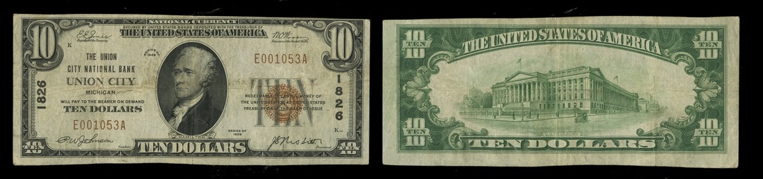 Michigan. Union City. Ch. 1826. Union City National Bank. $10 Type I. No. E001053A. Repaired. VF.