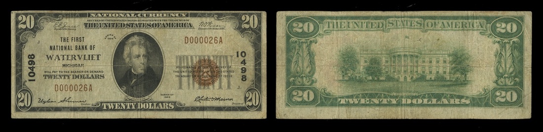 Michigan. Watervliet. Ch. 10498. First National Bank of Watervliet. $20. 1929 Type I. No. D000026A. About Fine.