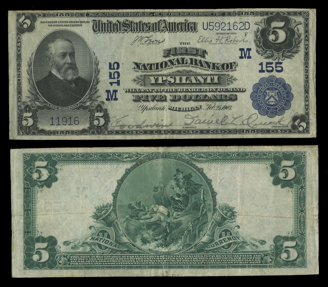 Michigan. Ypsilanti. Ch. 155. First National Bank of Ypsilanti. $5. 1902 Plain Back. Fr. 598. No. 11916. Very Fine.